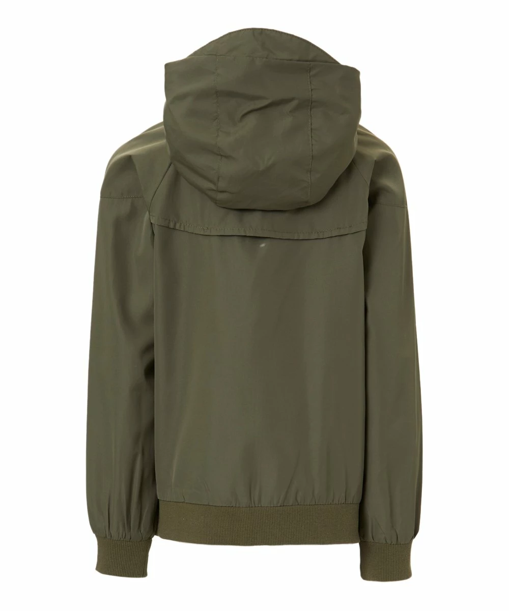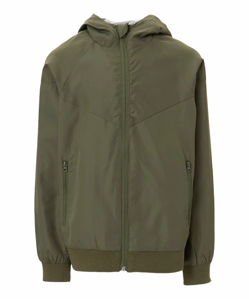 This hooded lightweight windbreaker features a elastic at the cuffs and waist. A zip closure and front pockets complete the look.