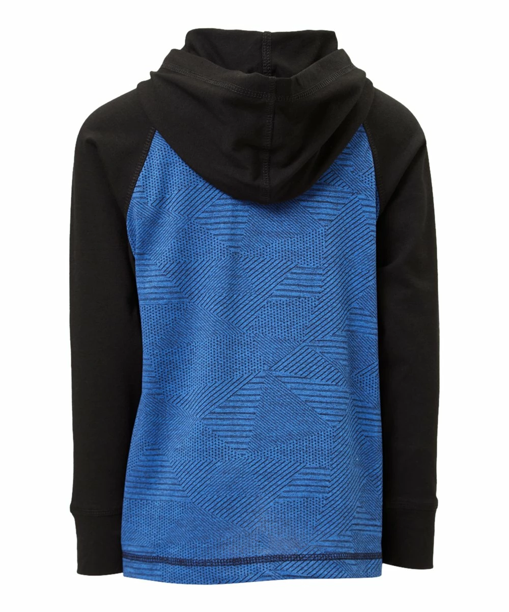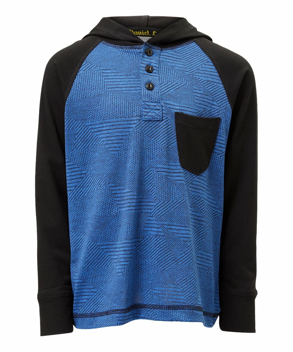 This long-sleeve henley features a hood and sporty raglan sleeves.