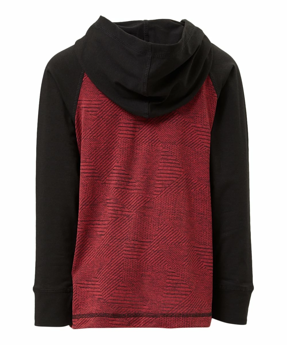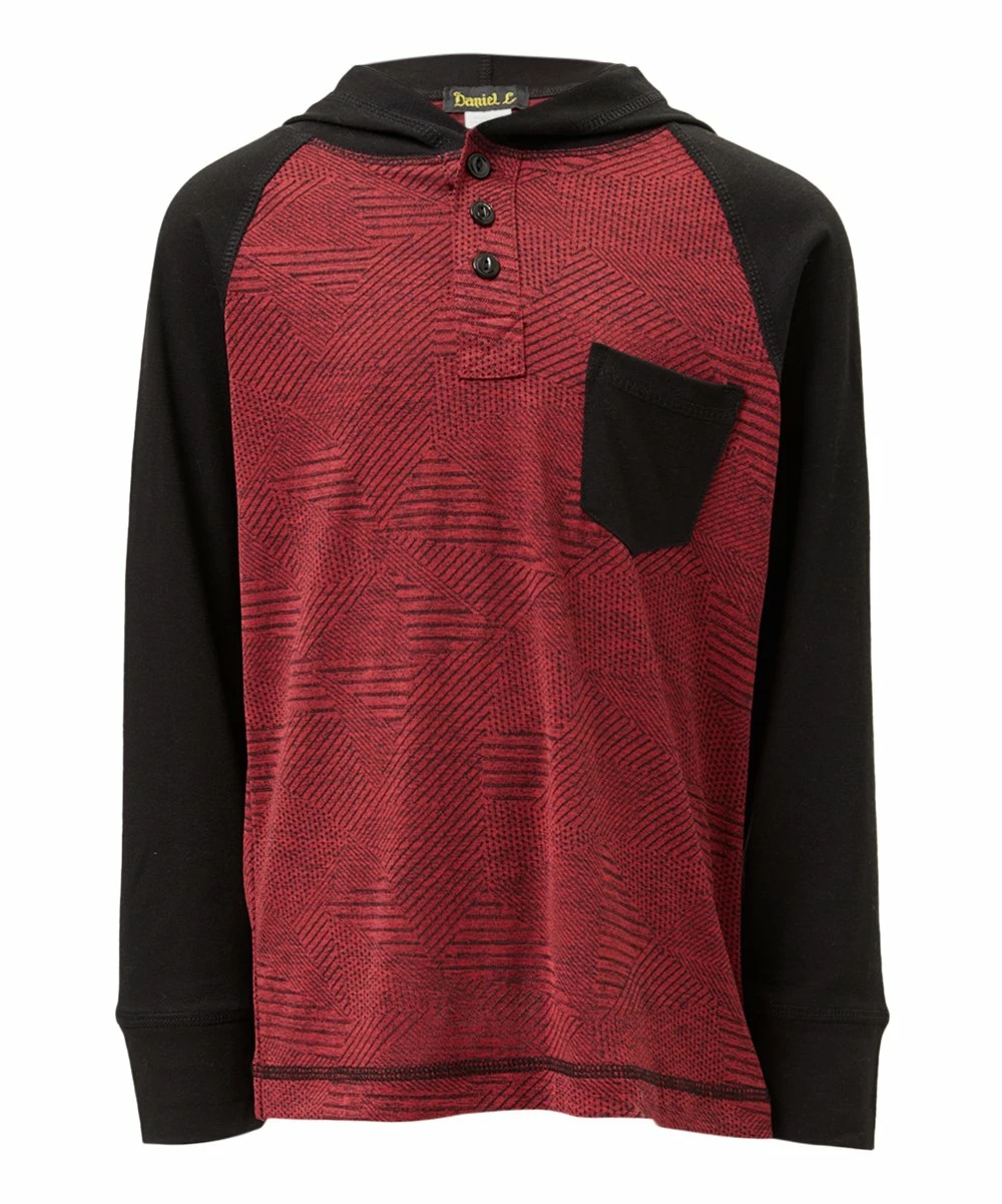 This long-sleeve henley features a hood and sporty raglan sleeves.