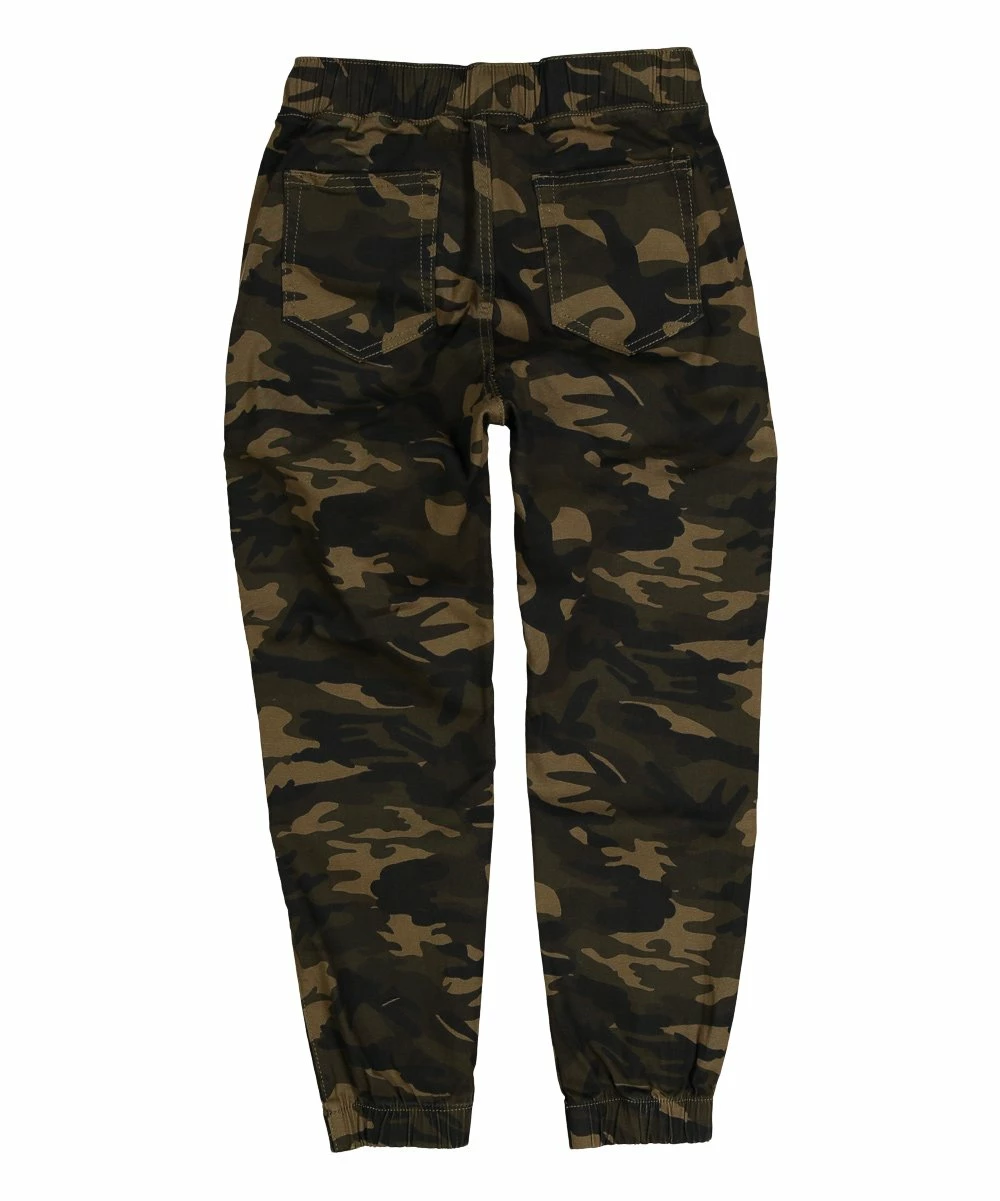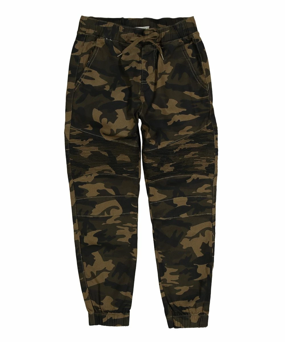 He’s destined to become the hide-and-seek champ in this pair of camo-covered joggers that feature a bold knee-pad design and soft, cottony comfort.