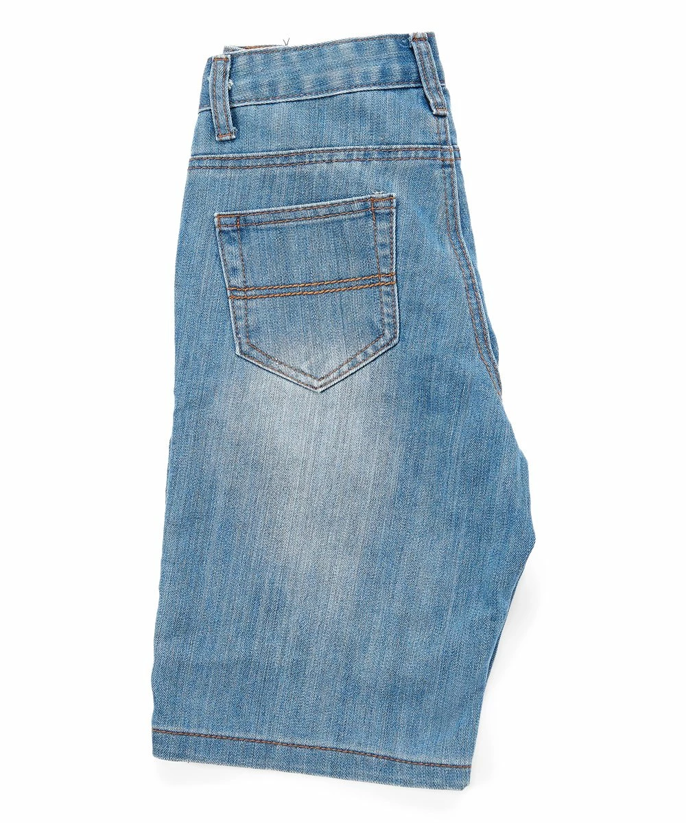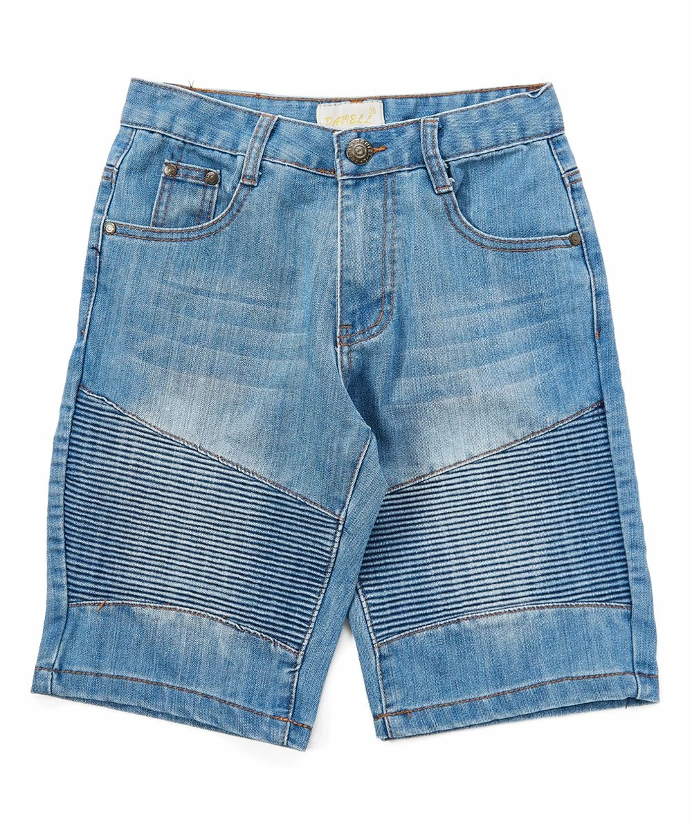 Little ones can imbue their ensemble with edgy retro flair by donning these cotton-stretch blend denim shorts sporting subtle moto detailing at the mid-thigh.