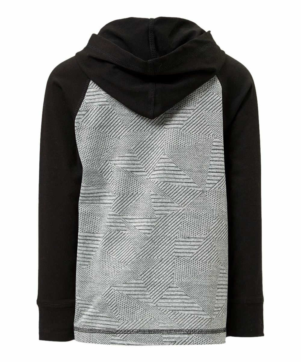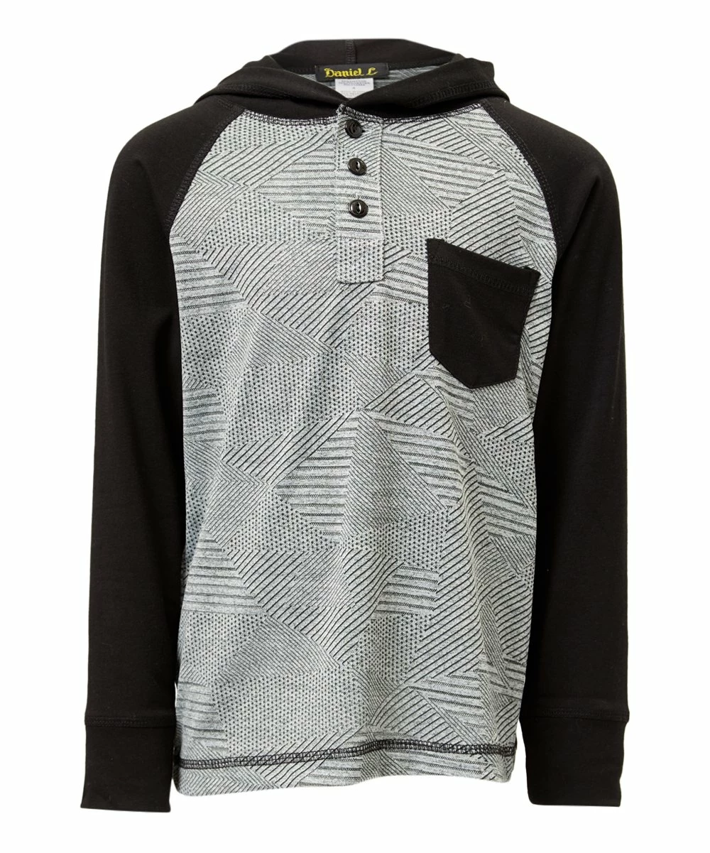 This long-sleeve henley features a hood and sporty raglan sleeves.