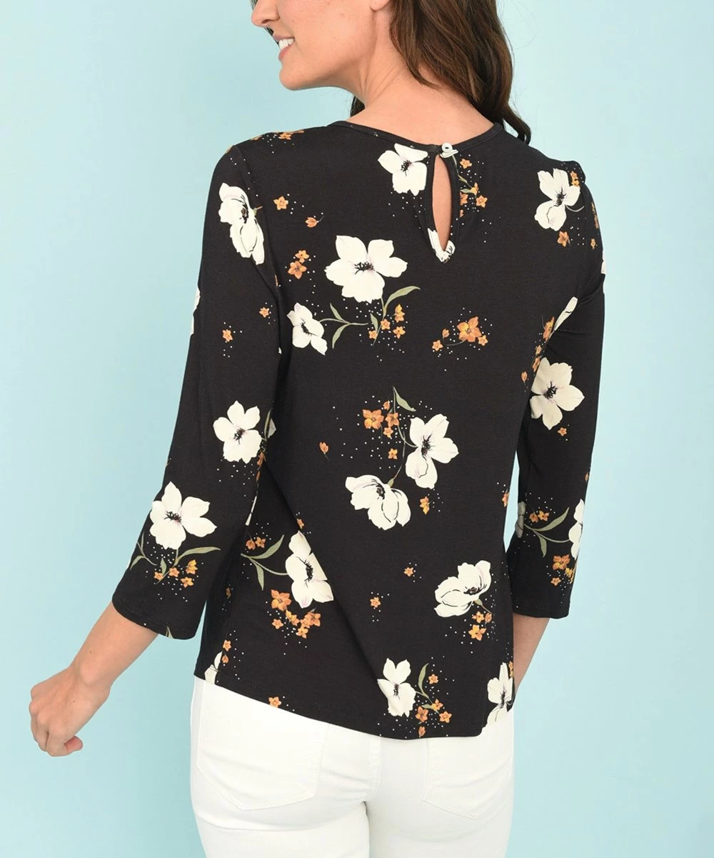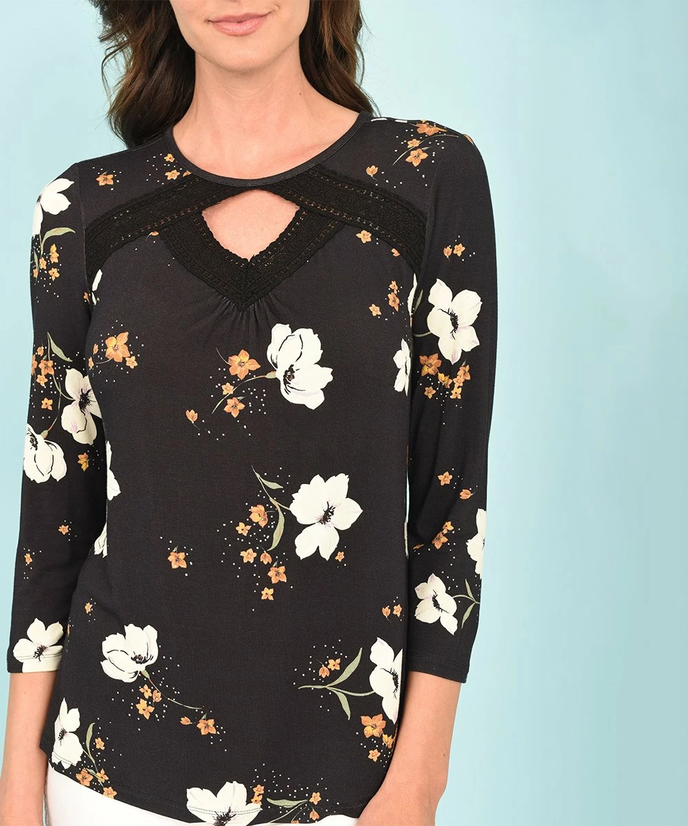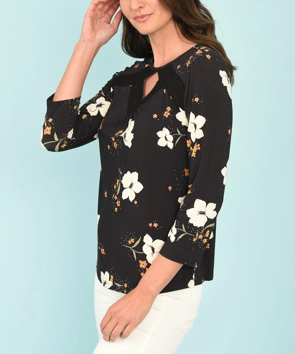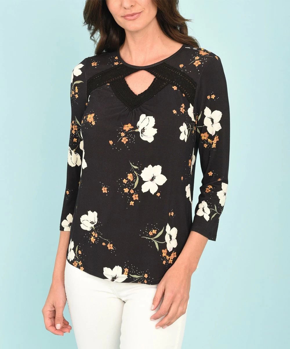Reflect your romantic spirit with this cutout-neck floral top finished with versatile three-quarter sleeves.