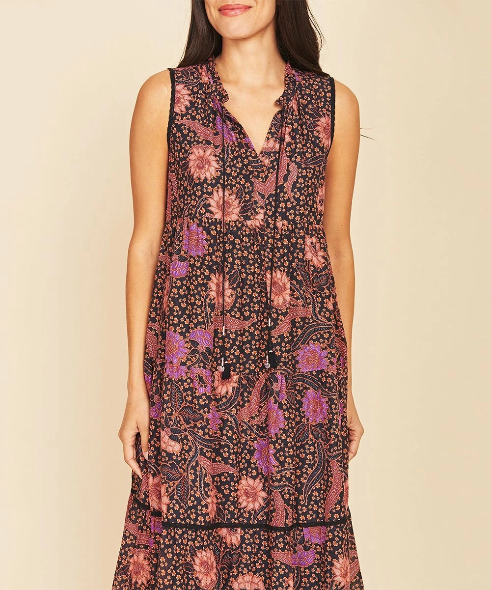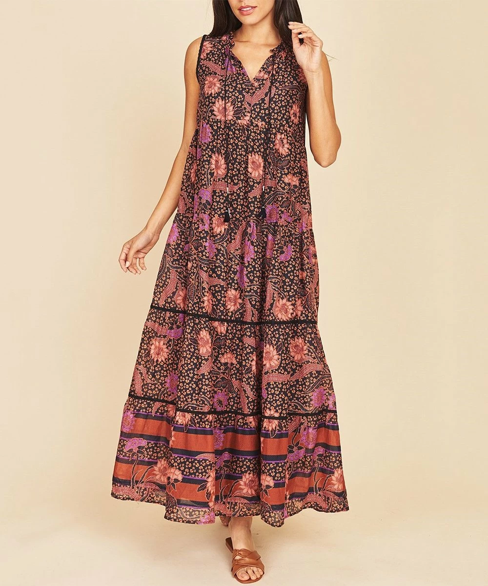Breezy and chic, this free-flowing maxi will take you through sunny days in style. A lack of sleeves keeps it cool, and a tie at the neckline adds bohemian charm.