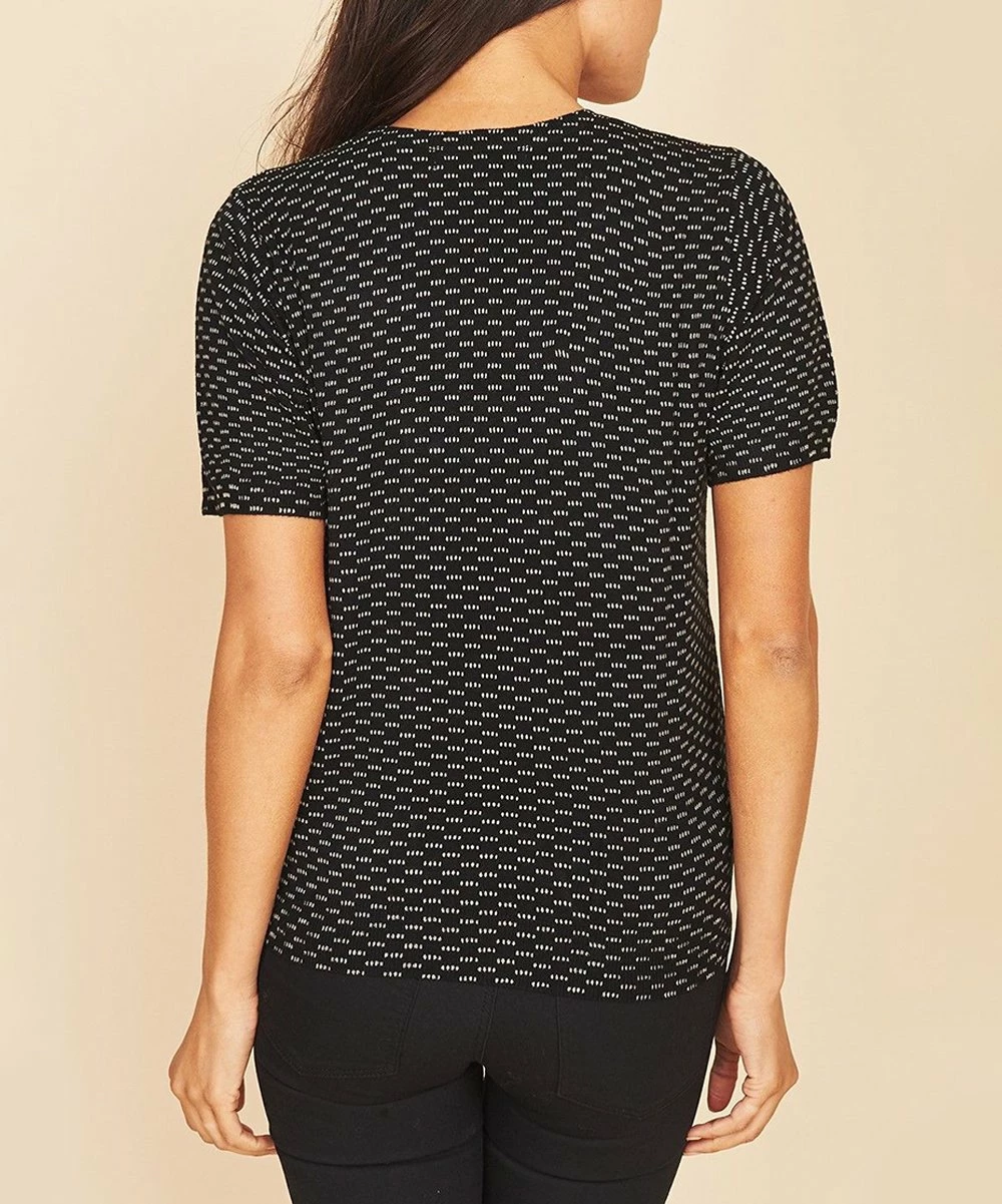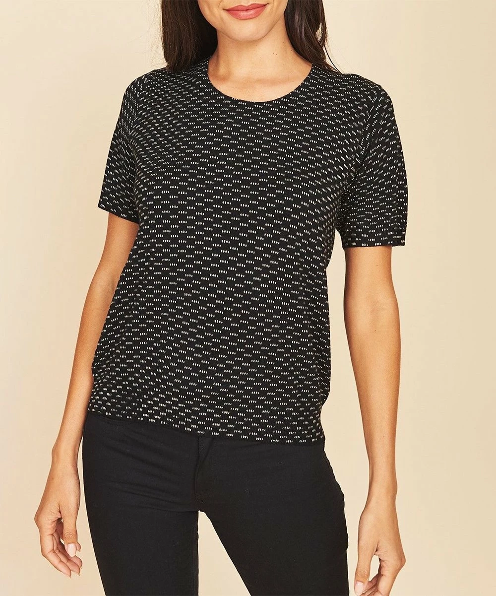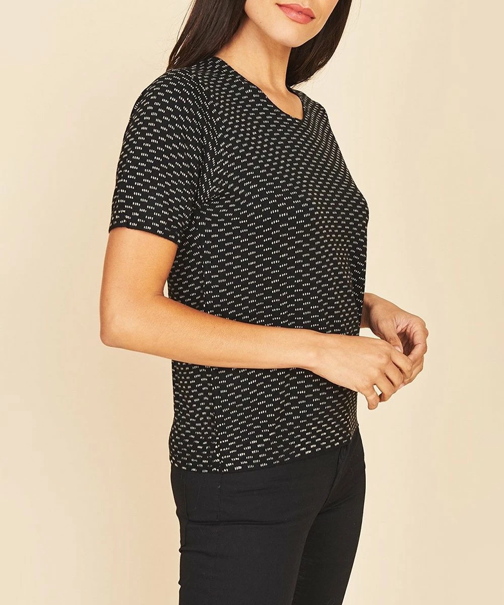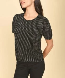 A subtle geometric pattern adds eye-catching appeal to this cozy short-sleeve sweater.
