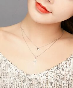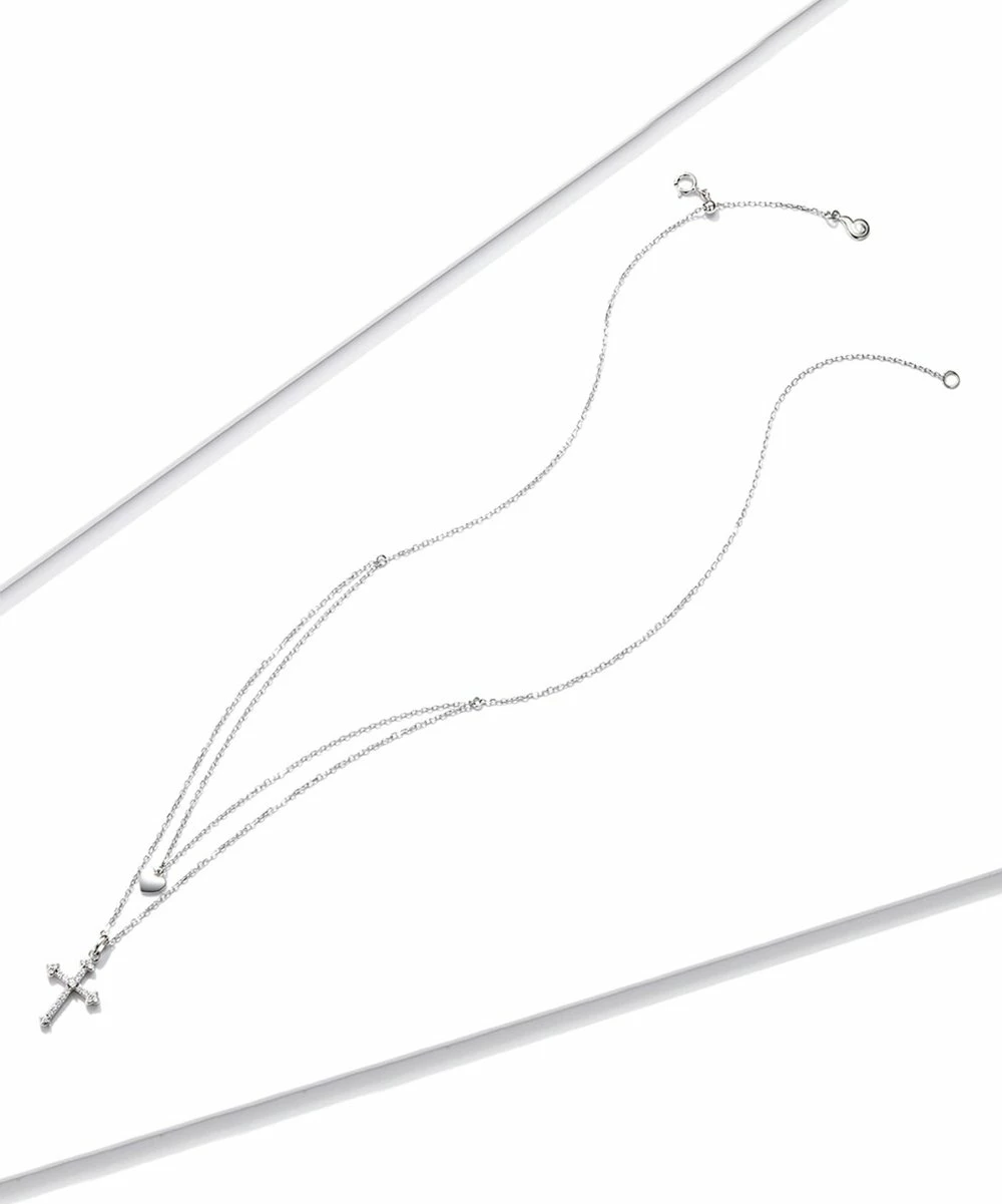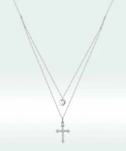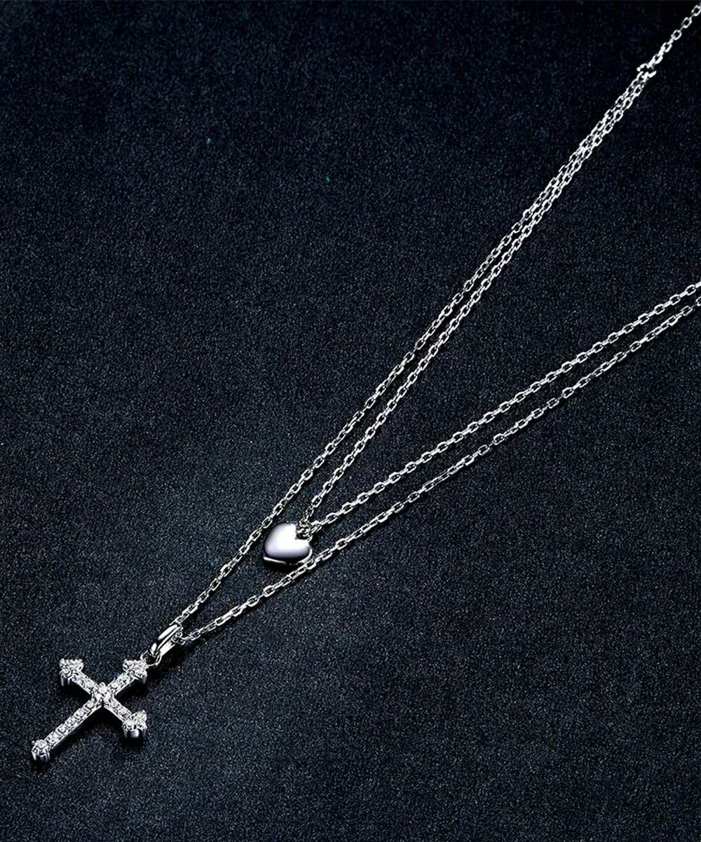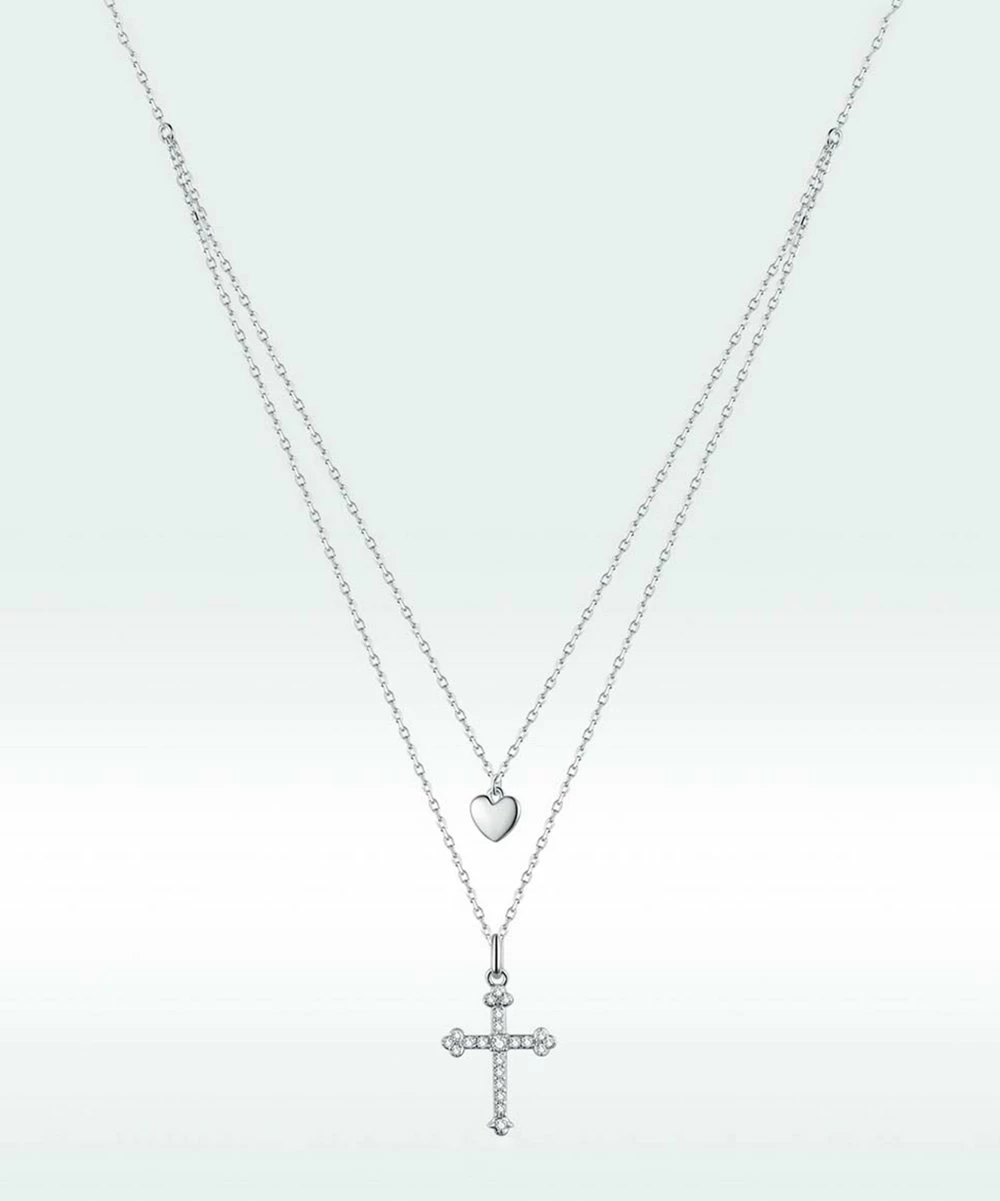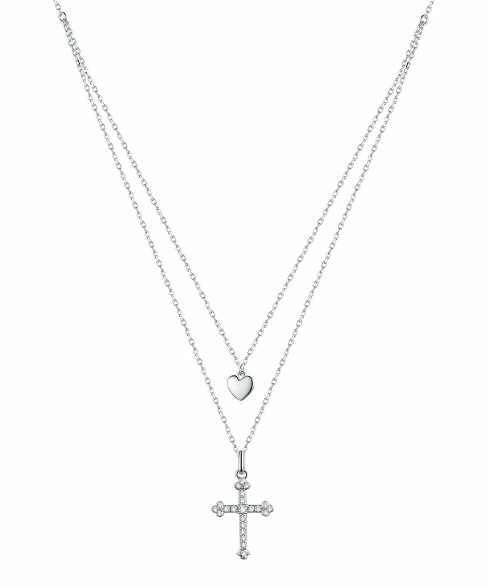 Proudly display your faith by decorating your neckline with this sterling silver layer necklace featuring a heart and cross pendant.